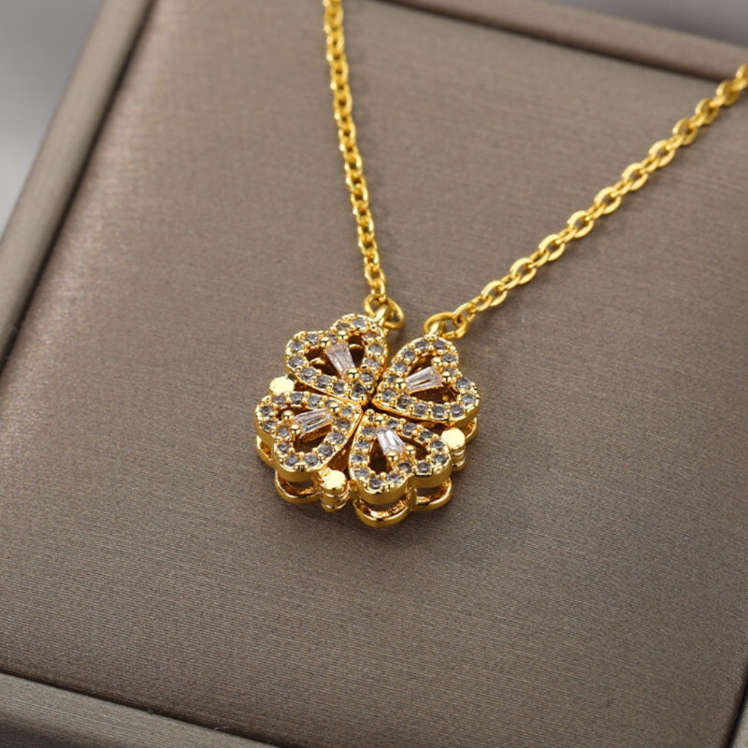 Colar Trevo - 4 Corações: é uma joia que incorpora a sorte e o amor em um design verdadeiramente encantador. Este colar apresenta um pingente em formato de trevo que é cravejado com detalhes brilhantes, capturando a luz de maneira deslumbrante. O pingente tem uma característica única: ele se abre por meio de uma conexão magnética, revelando quatro corações.