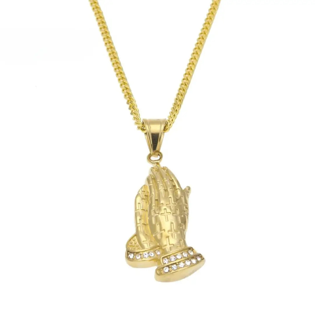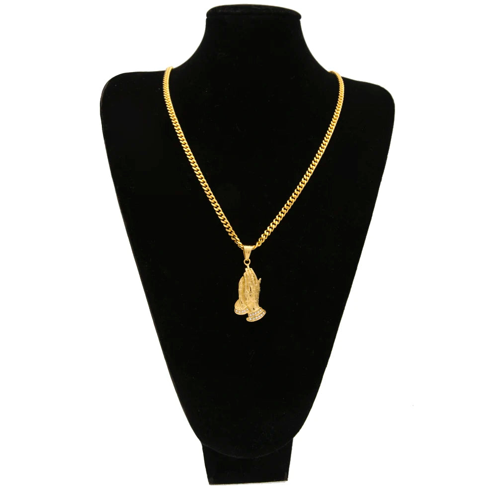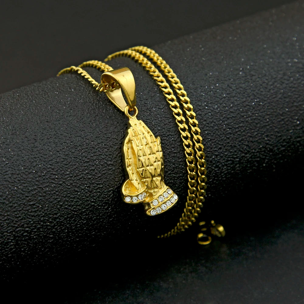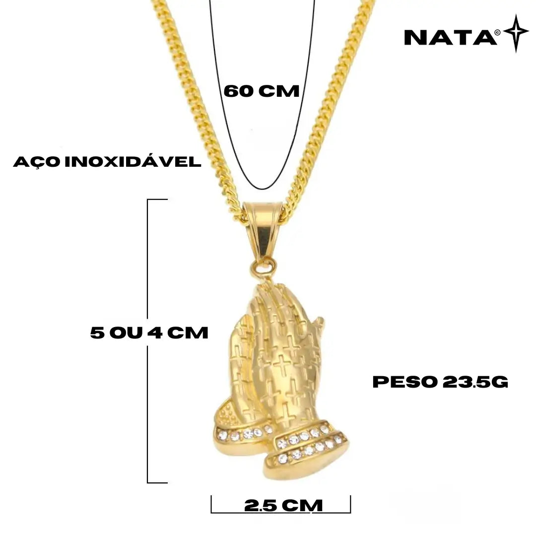 Pingente Oração Cravejado + Corrente: Corrente de aço inoxidável banhado a ouro com um elegante pingente cravejado em formato de mãos orando. Um símbolo de fé e estilo, ideal para expressar sua espiritualidade com sofisticação.