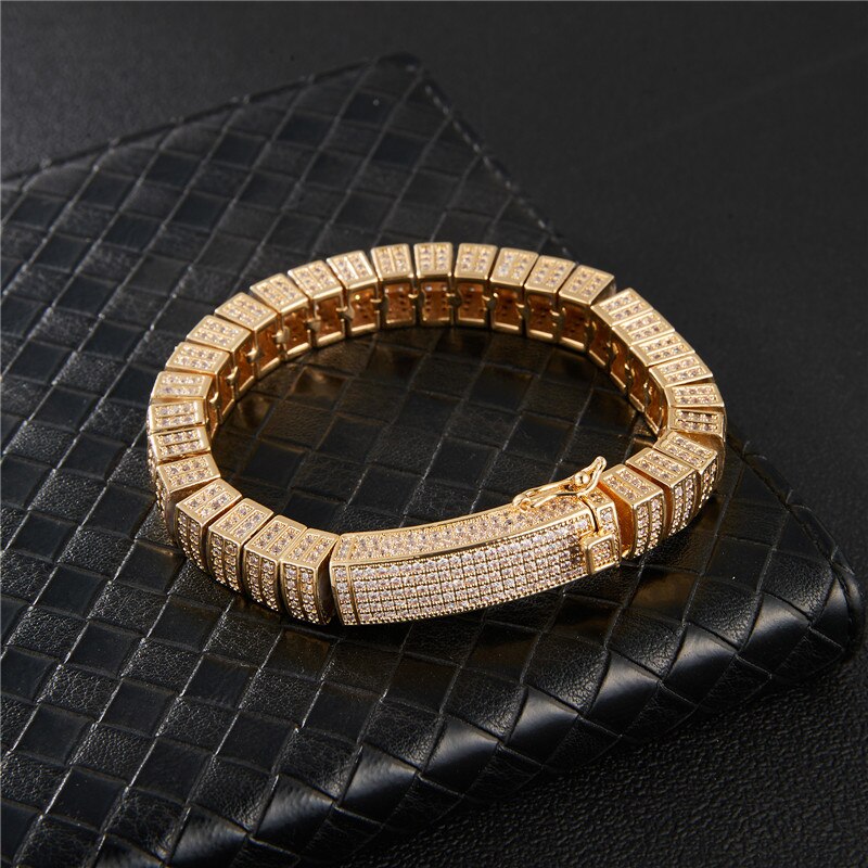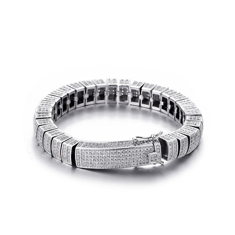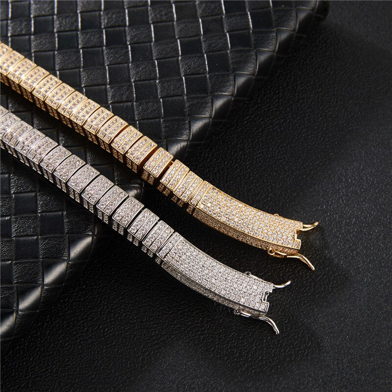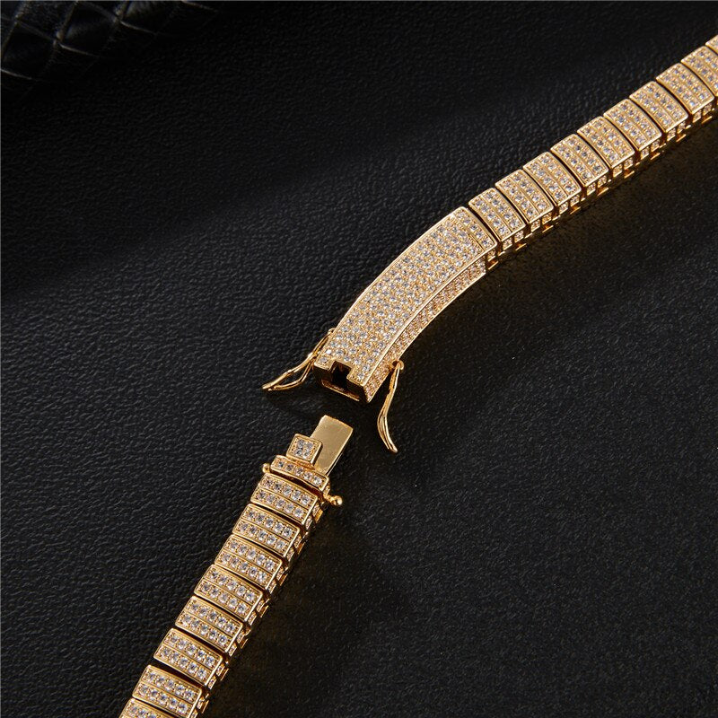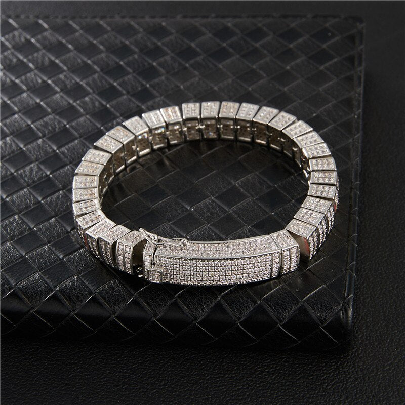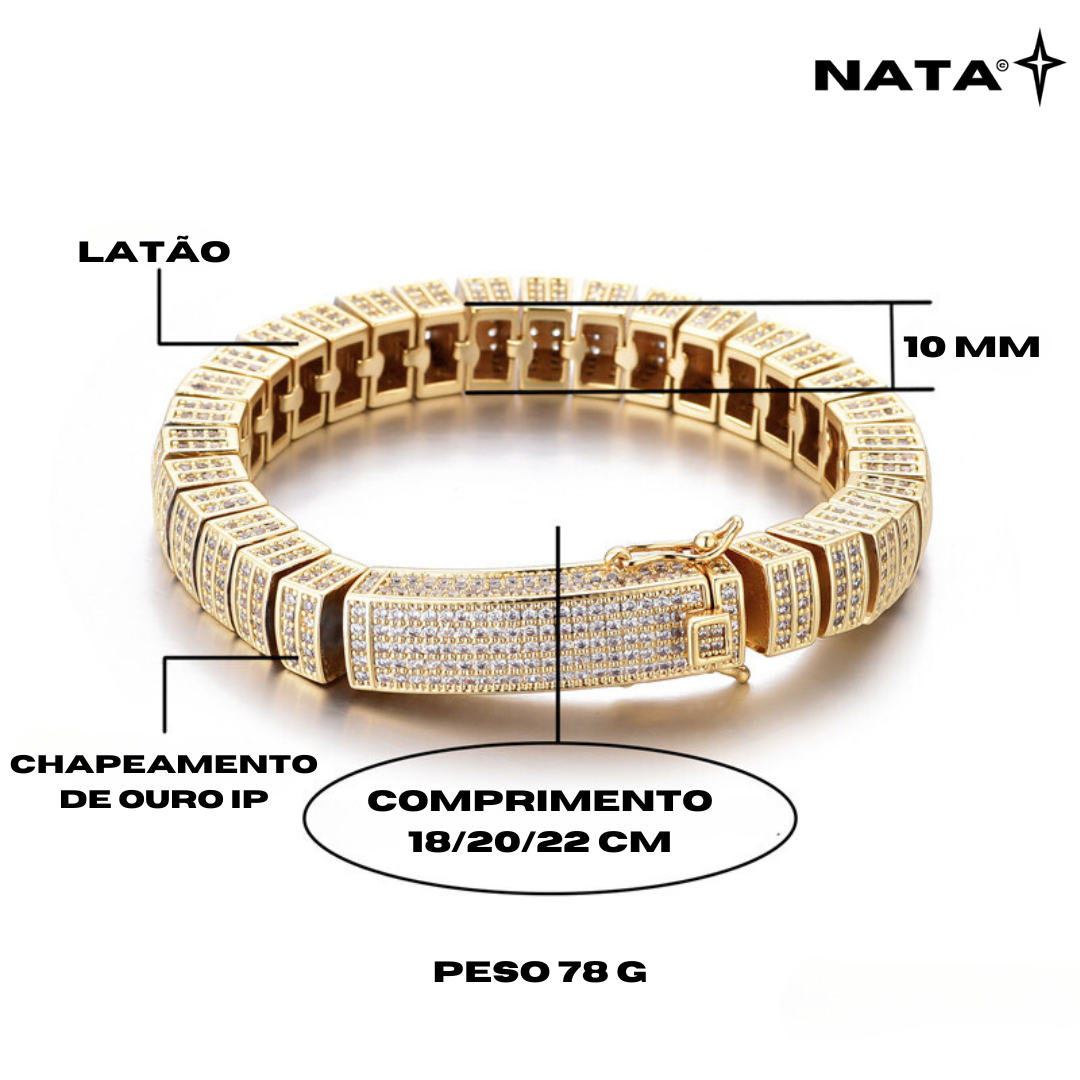 A Pulseira Riviera Cravejada Retangular é uma joia que combina o luxo das pedras cravejadas com um design duplo de pedras baguete, criando um visual estiloso. Esta pulseira apresenta uma série de pedras duplas baguete meticulosamente cravejadas ao longo de seu comprimento, criando uma aparência de dupla fileira de pedras.